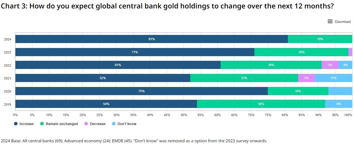 Στη μεγάλη ετήσια επισκόπηση που διεξήγαγε το WGC, το 29% των διεθνών κεντρικών τραπεζών δήλωσε πως σκοπεύει να αυξήσει περαιτέρω τα αποθέματα χρυσού μέσα στους επόμενους δώδεκα μήνες, που είναι το υψηλότερο ποσοστό που έχει καταγραφεί σε ανάλογη επισκόπηση της διεθνούς εμπορικής ένωσης χρυσού με έδρα τη Βρετανία.