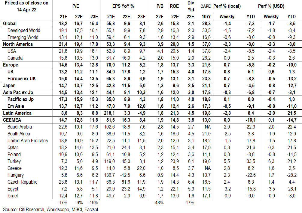 Η Citi προβλέπει μέτρια άνοδο (περίπου 7%) για τον δείκτη MSCI AC World μέχρι το τέλος του έτους και εξακολουθεί να πιστεύει ότι έχει νόημα οι επενδυτές να αγοράσουν τις πτώσεις των μετοχών, όσο οι πραγματικές αποδόσεις των ομολόγων παραμένουν αρνητικές. Οι μετοχές αντιμετωπίζουν αυξανόμενα αρνητικά δεδομένα από τις υψηλότερες αποδόσεις των ομολόγων, τις υποβαθμίσεις των κερδών ανά μετοχή (EPS) και τη γεωπολιτική.