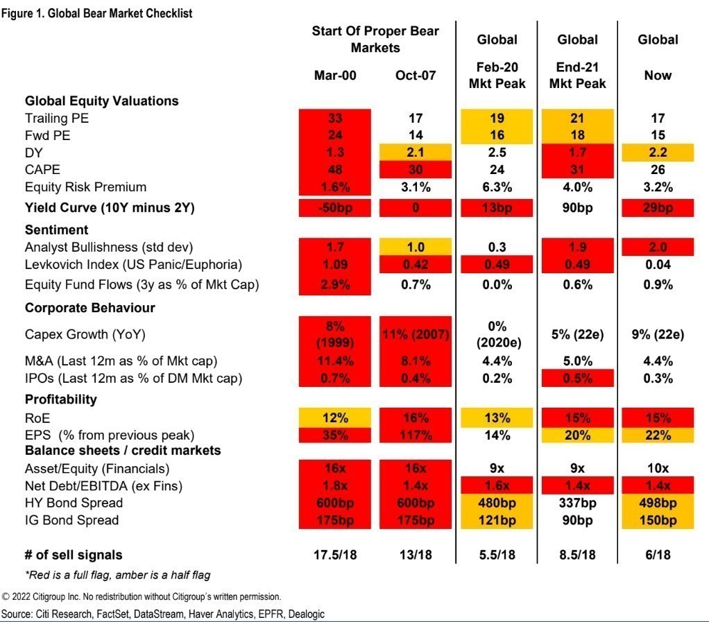 Ο κατάλογος ελέγχου Bear Market Checklist (BMC) που έχει καταρτίσει η Citigroup για να ελέγχει τις συνθήκες στις αγορές μετοχών προτείνει στους επενδυτές να αγοράσουν τη φετινή πτώση των μετοχών, δεδομένου ότι τα αρνητικά σήματα είναι μόλις 8,5 στα 18, αριθμός που δεν είναι ικανός για να αποτρέψει τους επενδυτές από το αγοράσουν τις μετοχές.