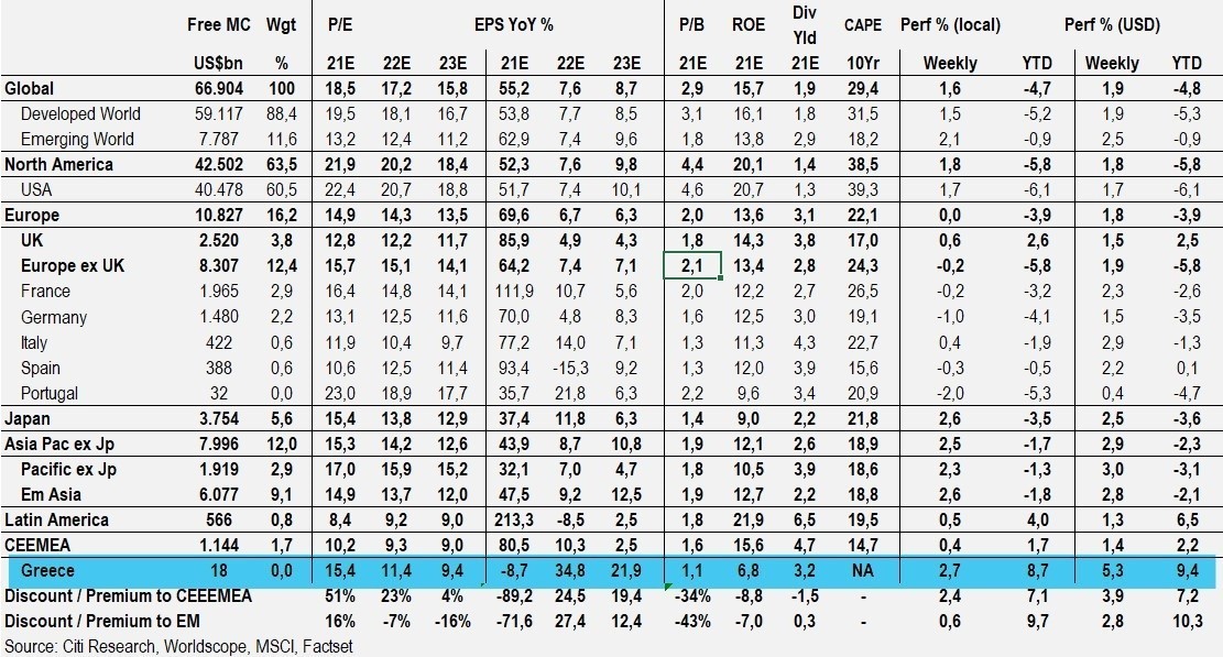 H Ελλάδα επίσης εμφανίζεται ως φθηνή σε σχέση με τις αγορές μετοχών των ΗΠΑ, της Ευρώπης και του κόσμου, αφού ο δείκτης P/E στην αγορά των ΗΠΑ κινείται στις 21,9 φορές φέτος και 20,2 φορές το επόμενο έτος ενώ για την Ευρώπη ο δείκτης τοποθετείται στις 14,9 φορές και στις 14,3 φορές το 2023, που αποτελεί για τους επενδυτές το έτος σύγκρισης στην πραγματικότητα.