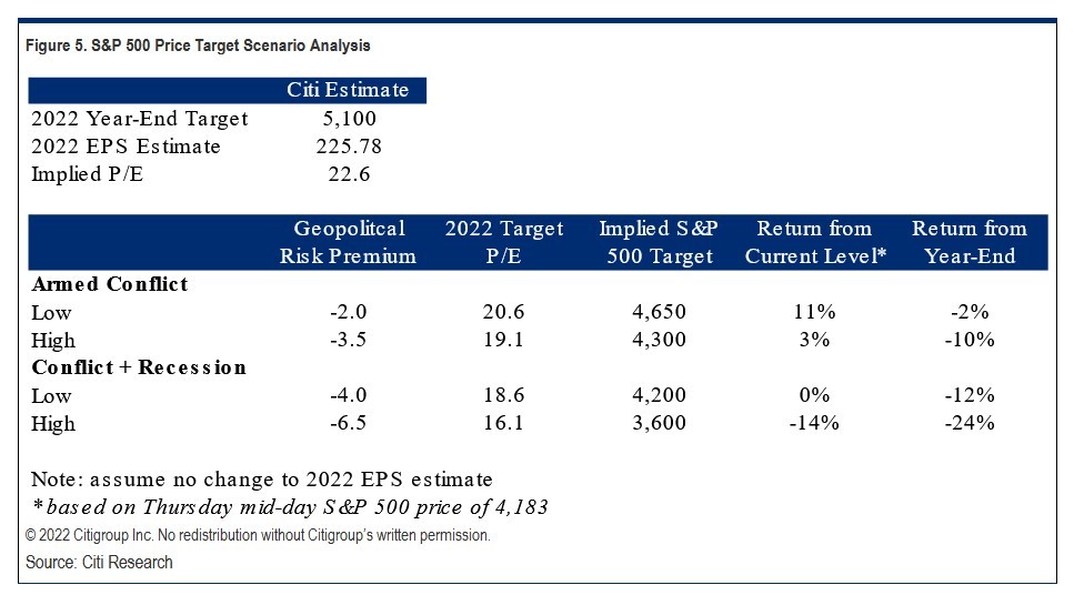 Βάσει των σεναρίων που εξετάζει η Citi, από το βασικό στόχο των 5.100 μονάδων μπορούμε να κινηθούμε στις 3.600 μονάδες σε περίπτωση ενός σεναρίου εισβολής και ύφεσης.