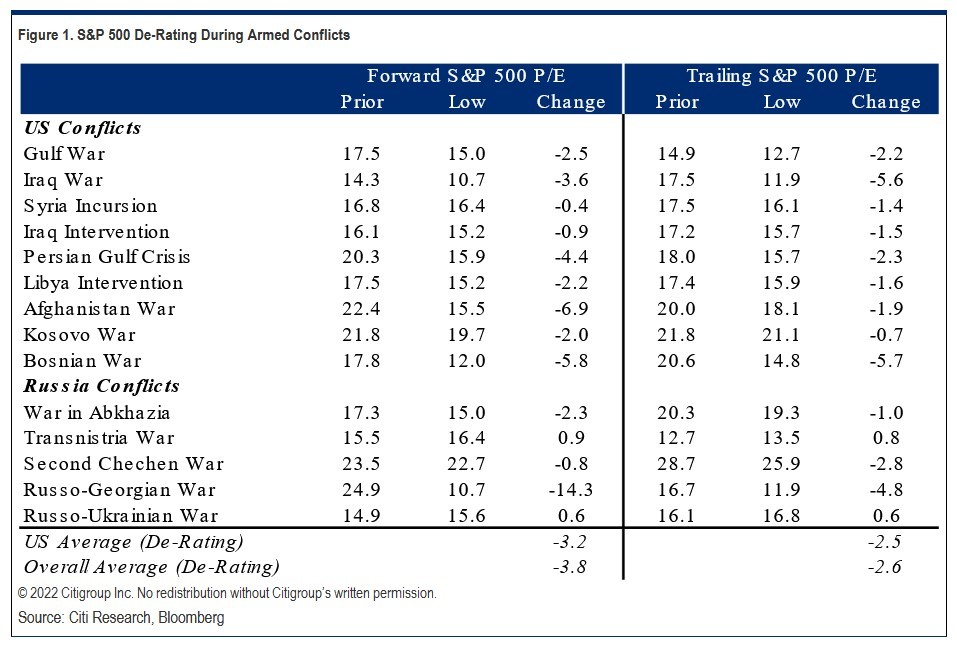 «Ο S&P 500 εισήλθε σε διορθωτικό έδαφος πριν από τα γεγονότα των δύο τελευταίων ημερών. Αποδίδουμε μεγάλο μέρος της υποχώρησης κατά -5% από τα μέσα Φεβρουαρίου στις ανησυχίες για τη Ρωσία/Ουκρανία. Η διάρκεια και η έκταση της σύγκρουσης δεν έχουν ακόμη καθοριστεί. Εν τω μεταξύ, τα επίπεδα των τιμών των εμπορευμάτων μειώνουν την εμπιστοσύνη στη συνεχιζόμενη μετα-πανδημική ανάκαμψη. Όμως, στον αντίποδα, τα παραπάνω μπορεί να αποσύρουν κάποια πίεση από τη Fed για σύσφιξη της νομισματικής πολιτικής. Από εδώ και πέρα, αναμένουμε μια σταδιακή ανοδική πορεία για τις αμερικανικές μετοχές, αλλά με χαμηλότερες αποτιμήσεις λόγω του αυξημένου πριμ γεωπολιτικού κινδύνου», συνοψίζει η Citigroup την κατάσταση στις μετοχές μετά τη ρωσική εισβολή στην Ουκρανία.