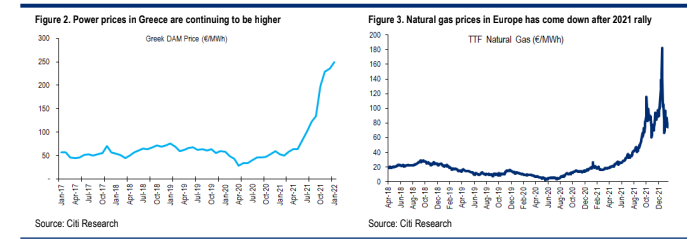 Oπως τονίζει η αμερικάνικη τράπεζα, η Mytilineos θα επωφεληθεί από τις υψηλές τιμές ενέργειας/φυσικού αερίου. Το φυσικό αέριο, που αποτελεί βασικό στοιχείο για την παραγωγή ηλεκτρικής ενέργειας της Mytilineos, θεωρείται ως ένα από τα “βαρίδια” για τα κέρδη της από την αγορά. Ωστόσο, η Citi επαναλαμβάνει την άποψή της ότι οι θετικές κινήσεις στα ελληνικά spreads μεταξύ της τιμής χονδρικής του ρεύματος και το κόστος παραγωγής του με τη χρήση φυσικού αερίου (spark) και η ανάκαμψη στην παραγωγή ηλεκτρικής ενέργειας, θα αντικατοπτριστούν στο EBITDA του δ’ τριμήνου του 2021 στον τομέα.