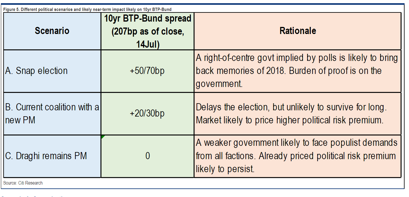 Ο κυβερνητικός συνασπισμός εξακολουθεί να έχει μια εφικτή πλειοψηφία χωρίς το κίνημα των Πέντε Αστέρων M5S και ο Πρόεδρος έχει καθήκον να διερευνήσει το ενδεχόμενο μιας εναλλακτικής κυβέρνησης. Αυτό θα καθυστερούσε τις εκλογές, αλλά μια τέτοια κυβέρνηση είναι απίθανο να επιβιώσει μέχρι το 2023, καθώς τα κόμματα του συνασπισμού προωθούν λαϊκίστικες πολιτικές για να διακριθούν μπροστά στο εκλογικό σώμα μέχρι τις προγραμματισμένες εκλογές. Όσον αφορά τον υποψήφιο πρωθυπουργό, τα τοπικά μέσα ενημέρωσης έχουν προτείνει τους δύο επικρατέστερους υποψήφιους για την αντικατάσταση του Ντράγκι κατά τη διάρκεια των προεδρικών εκλογών του Ιανουαρίου: Ο υπουργός Οικονομικών Φράνκο και ο πρόεδρος του Συνταγματικού Δικαστηρίου Αμάτο (ο οποίος επίσης πλησιάζει στο τέλος της θητείας του). Αυτό απλώς θα καθυστερήσει τις εκλογές, αλλά θα διατηρήσει το ασφάλιστρο πολιτικού κινδύνου σε υψηλά επίπεδα στα BTPs και η Citi θα περιμέναμε ότι αυτό το σενάριο θα διευρύνει το 10ετές BTP-Bund κατά 20-30 μ.β.