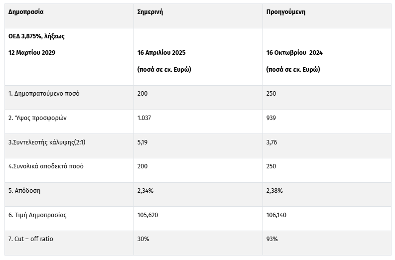 Οι συνολικές προσφορές ανήλθαν σε 1.037 εκατ. Ευρώ (υπερκάλυψη κατά 5,19 φορές) και η ημερομηνία διακανονισμού είναι η Παρασκευή 25 Απριλίου 2025.