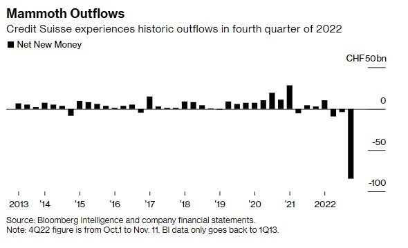 Την Τετάρτη, η διοίκηση της ιστορικής τράπεζας έκανε γνωστό ότι οι ζημιές θα φθάσουν το 1,5 δισ. φράγκα στο τελευταίο τρίμηνο του 2022, καθώς από την 1η Οκτωβρίου έως τις 11 Νοεμβρίου οι πελάτες «σήκωσαν» και απέσυραν 84 δισ. φράγκα.