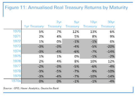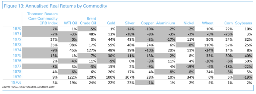 Με τους αυξανόμενους φόβους ότι οδεύουμε προς στασιμοπληθωρισμό, οι επενδυτές ρωτούν όλο και περισσότερο πώς θα πρέπει να τοποθετηθούν σε ένα τέτοιο περιβάλλον, εξηγούν οι Harry Allen και Jim Reid της Deutsche Bank. «Δυστυχώς, τα κύρια συμπεράσματα από τη δεκαετία του 1970 είναι αρκετά κακά, καθώς σε πραγματικούς όρους ήταν μια τρομερά κακή δεκαετία για τις μετοχές και τα ομόλογα σε πολλές χώρες», εξηγούν οι αναλυτές της τράπεζας. Ενώ αυτή η δεκαετία είναι νεαρή και ο υψηλός πληθωρισμός έχει διαρκέσει μόλις λίγο περισσότερο από ένα χρόνο μέχρι στιγμής, μπορούμε ήδη να δούμε παρόμοια μοτίβα μεταξύ του τρόπου με τον οποίο τα διάφορα περιουσιακά στοιχεία απέδωσαν τη δεκαετία του 1970 και πώς τα πάνε σήμερα.