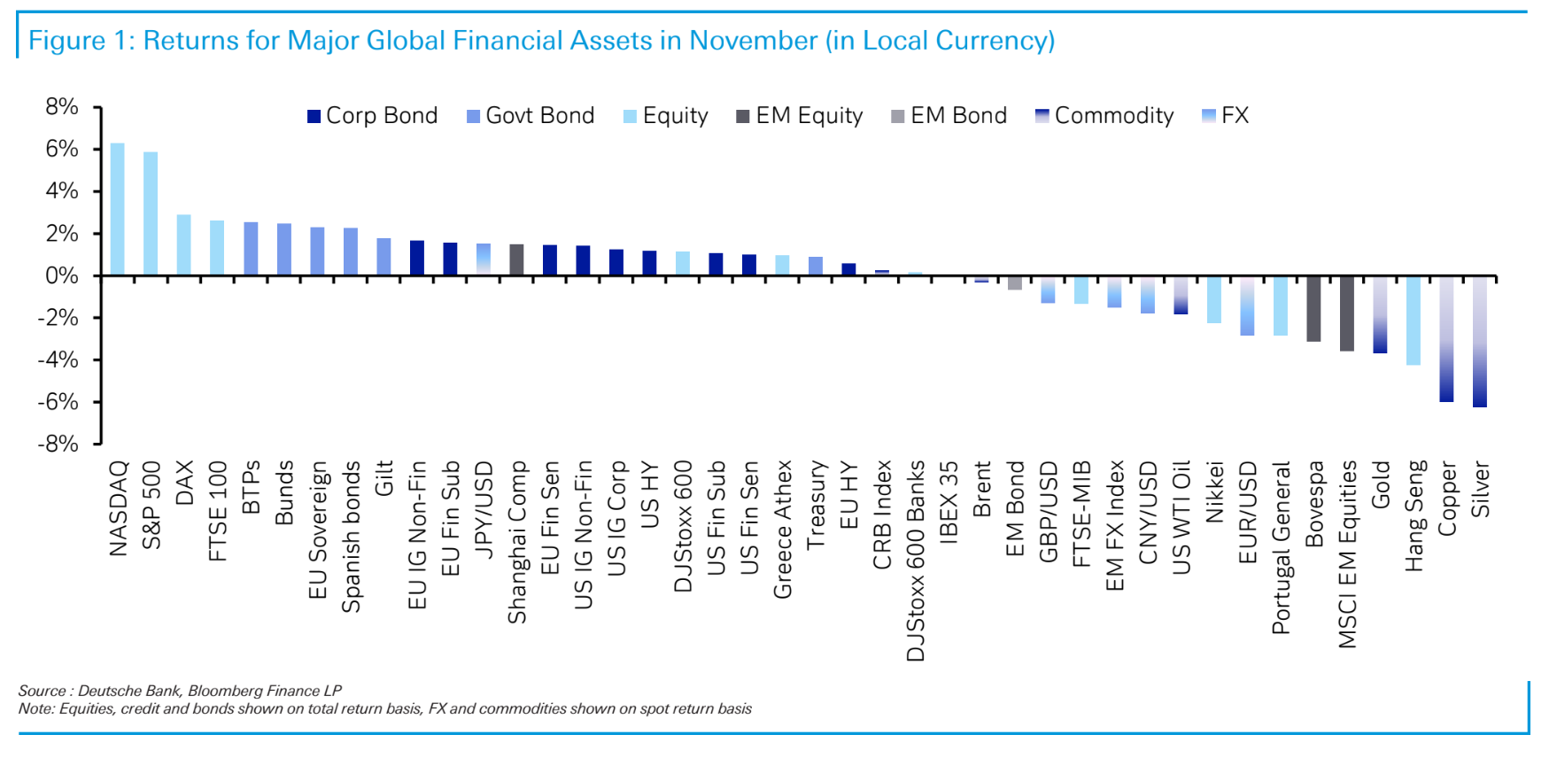 Η Deutsche Bank εξηγεί ότι οι αγορές σημείωσαν συνολικά αξιοπρεπείς επιδόσεις τον Νοέμβριο, με τις αμερικανικές μετοχές να αντιδρούν από τις απώλειες του Οκτωβρίου, καθώς ο S&P 500 κατέγραψε άλλο ένα ιστορικό υψηλό.