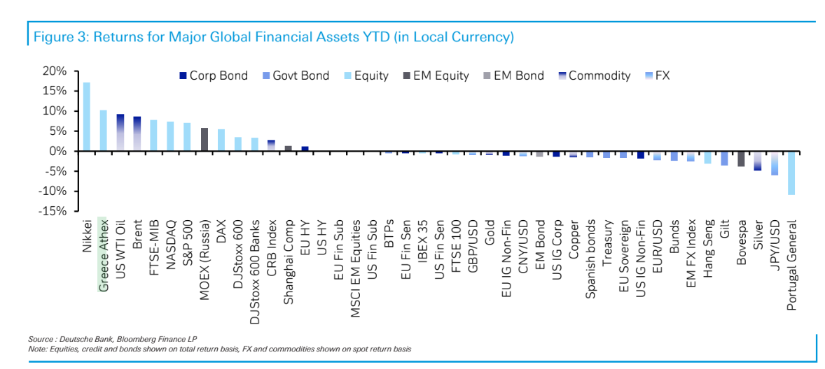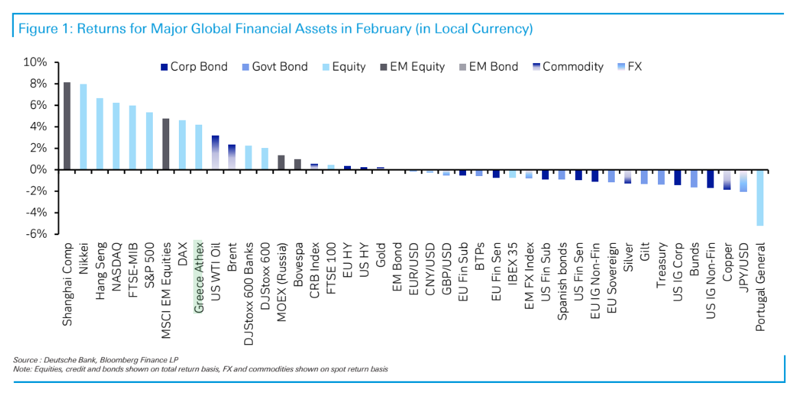 Ο Φεβρουάριος ήταν άλλος ένας ισχυρός μήνας για τα περιουσιακά στοιχεία κινδύνου, με αρκετές μεγάλες μετοχές και δείκτες σε υψηλά ρεκόρ, εξηγεί η γερμανική τράπεζα Deutsche Bank.