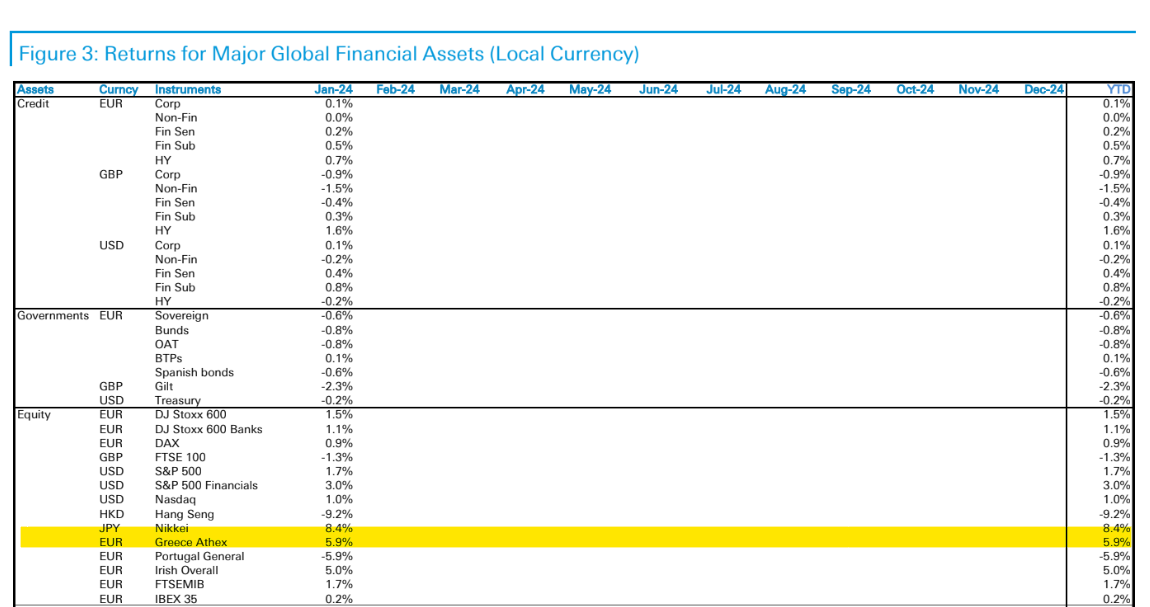«Ο Ιανουάριος ήταν ένας συνολικά ένας μήνας με αποκλίνουσες επιδόσεις για τις αγορές. Τα οικονομικά στοιχεία συνέχισαν να εκπλήσσουν θετικά, γεγονός που βοήθησε τις μετοχές να συνεχίσουν τα κέρδη τους από τα τέλη του 2023. Ο S&P 500 σημείωσε νέο ιστορικό υψηλό. Τα κρατικά ομόλογα έχασαν έδαφος, καθώς οι επενδυτές περιόρισαν την προοπτική μείωσης των επιτοκίων το α’ τρίμηνο, με το πρόεδρο της Fed Πάουελ να υποδηλώνει ότι μια μείωση έως τον Μάρτιο είναι απίθανη», εξηγεί η τράπεζα.
