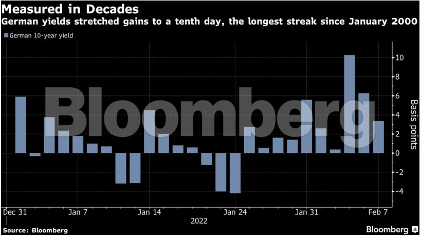 Στη Γερμανία, που αποτελεί μια από τις χώρες με τη μεγαλύτερη «παράδοση» αρνητικών επιτοκίων, η απόδοση του 10ετούς σημείωσε για 10η συνεχόμενη μέρα αύξηση των αποδόσεων, κάτι που είχε να συμβεί εδώ και 22 χρόνια. Οι αποδόσεις αυξήθηκαν στις 23 μονάδες βάσης από -18 μονάδες βάσης στα τέλη του 2021.