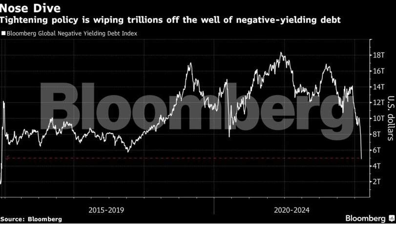 Η δεξαμενή των ομολόγων με απόδοση κάτω του μηδενός – που προσφέρουν στους επενδυτές εγγυημένη ζημιά αν κρατηθούν μέχρι τη λήξη τους – αντιστοιχεί τώρα σε σχεδόν 4,9 τρισ. δολάρια, που είναι το χαμηλότερο επίπεδο από τον Δεκέμβριο του 2015, σύμφωνα με τα στοιχεία του σχετικού δείκτη του Bloomberg. Στην Ευρώπη, το ποσό έχει μειωθεί κατά 80% από το υψηλό του Δεκεμβρίου του 2020 στο 1,9 τρισ. δολάρια, δηλαδή στο χαμηλότερο επίπεδο από τον Σεπτέμβριο του 2015. Το 2014 αντιστοιχούσε στο μηδέν.
