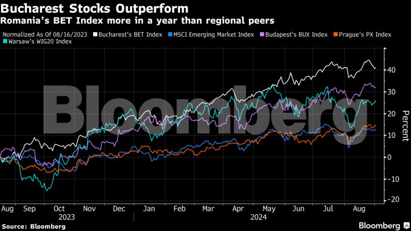 Ο χρηματιστηριακός δείκτης BET του Βουκουρεστίου έχει επιστρέψει σχεδόν 40% σε όρους δολαρίου τους τελευταίους 12 μήνες, η πέμπτη καλύτερη απόδοση μεταξύ περισσότερων από 90 πρωτογενών μετοχικών δεικτών που παρακολουθεί το Bloomberg. Ακόμη και μετά από τις αναταράξεις που σημειώθηκαν τον Αύγουστο, ο δείκτης βρίσκεται σε απόσταση αναπνοής από το υψηλό του ρεκόρ, έχοντας σημειώσει πρόοδο τους 13 από τους τελευταίους 15 μήνες.