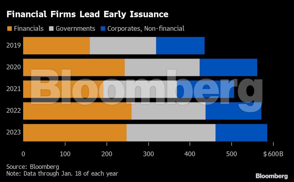 Η έκδοση κρατικών και εταιρικών ομολόγων επενδυτικής διαβάθμισης παγκοσμίως έφτασε τα 586 δισ. δολάρια έως τις 18 Ιανουαρίου. Είναι το υψηλότερο ποσό που έχει καταγραφεί ποτέ για αυτή την περίοδο, σύμφωνα με στοιχεία που συγκέντρωσε το Bloomberg.