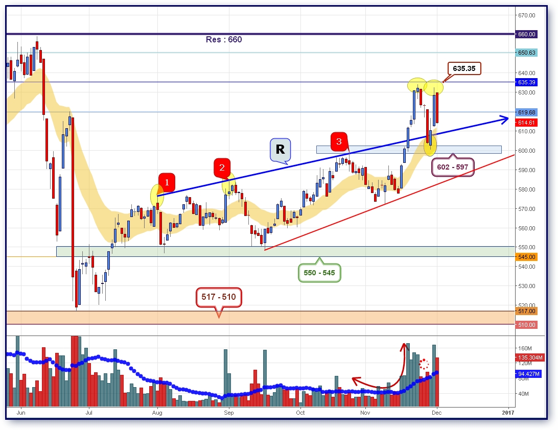 Ο Γενικός Δείκτης μετά την πρώτη επαφή με την περιοχή αντίστασης των 630 με 635 μονάδων επιχείρησε μια γρήγορη «εξαέρωση» βραχυχρόνιων διαγραμμάτων και τεχνικών δεικτών ορμής προς το ψυχολογικό όριο των 600 μονάδων δημιουργώντας έτσι συνθήκες αποσυμπίεσης και απόκτησης νέων δυνάμεων. Όντως ο Γενικός Δείκτης μετά την επαφή με το επίπεδο στήριξης των 602 με 597 μονάδων έκανε μια γρήγορη ανοδική επιστροφή πλησίον του προηγούμενου υψηλού των 634 μονάδων έχοντας ως χορηγό την αναδιάρθρωση των δεικτών του MSCI και το τραπεζικό κλάδο. Από εκεί και έπειτα το σημείο κλειδί, που ο Γενικός Δείκτης θα πρέπει να υπερκεράσει είναι οι 635 μονάδες. Διαγραμματικό γεγονός, όπου εάν επιβεβαιωθεί θα ανοίξει το οπτικό πεδίο για την πολύ σημαντική ζώνη αντίστασης των 655 με 660 μονάδων. Οποιαδήποτε όμως ανοδική δυσπραγία πέριξ των 635 μονάδων θα βάλει σε νέα δοκιμασία το ψυχολογικό όριο των 600 μονάδων.