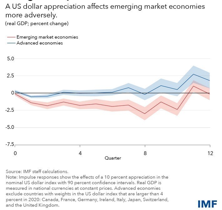 Η έκθεση του ΔΝΤ σχολιάζει πως οι επιπτώσεις της ενίσχυσης του δολαρίου επιβάρυναν άνισα τις αναπτυσσόμενες αγορές ακόμη και σε σχέση με τις μικρότερες αναπτυγμένες οικονομίες, λόγω της μεγαλύτερης ευελιξίας στις συναλλαγματικές ισοτιμίες. Αυτό είχε σαν αποτέλεσμα να υποστούν σημαντικές εκροές κεφαλαίων και να επιβαρυνθούν με υψηλότερες τιμές στις εισαγωγές και πιο «σφιχτές» χρηματοπιστωτικές συνθήκες.