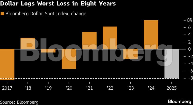 Ο δείκτης Bloomberg Dollar Spot Index υποχώρησε περίπου 8% μέσα στο έτος, ενώ οι αγορές στοιχηματίζουν σε περαιτέρω αποδυνάμωση. Μετά τη βουτιά που σημειώθηκε τον Απρίλιο, όταν ο Πρόεδρος των ΗΠΑ Ντόναλντ Τραμπ ανακοίνωσε νέους δασμούς, το δολάριο δεν κατάφερε να ανακάμψει σημαντικά, εν μέρει λόγω των προσδοκιών ότι ο Τραμπ θα επιλέξει διάδοχο του Τζερόμ Πάουελ με πιο «χαλαρή» νομισματική προσέγγιση, καθώς η θητεία του σημερινού προέδρου της Fed ολοκληρώνεται το επόμενο έτος.