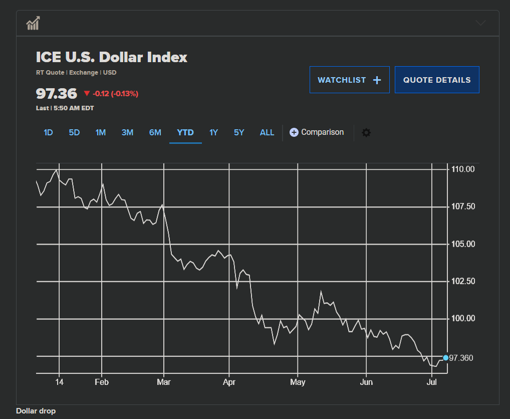 Το δολάριο υποχώρησε κατά 10,7% έναντι των σημαντικότερων νομισμάτων έως τον Ιούνιο, σημειώνοντας το χειρότερο α’ εξάμηνο από το 1973, όταν ο Νίξον κατήργησε το σύστημα ισοτιμιών του Μπρέτον Γουντς. Στο χαμηλότερο σημείο του, το νόμισμα έφτασε στο χαμηλότερο επίπεδο από τον Φεβρουάριο του 2022. Η μελλοντική πορεία του δε φαίνεται πολύ θετική.