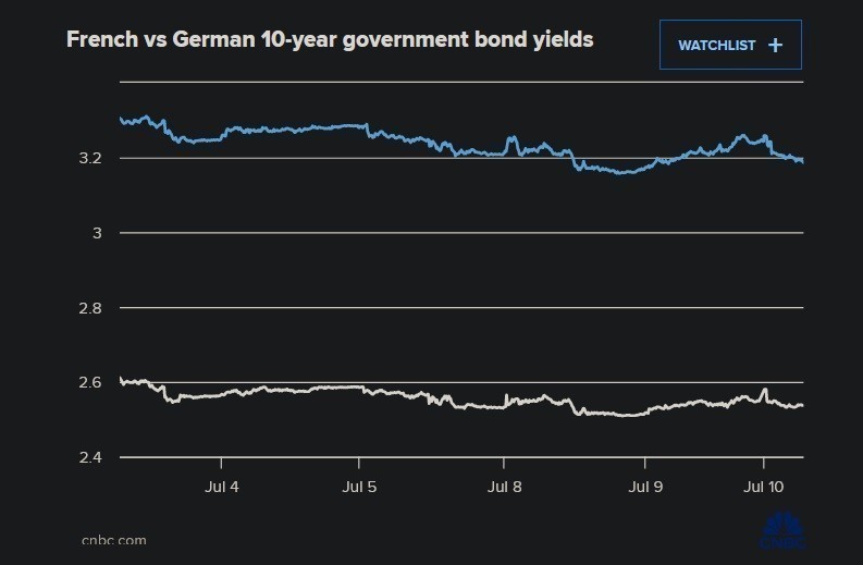 Η διαφορά μεταξύ των γαλλικών και γερμανικών αποδόσεων των 10ετών ομολόγων κυμαινόταν περίπου στις 70 μονάδες βάσης την Τετάρτη, από το υψηλό 12 ετών των 85 μονάδων βάσης που είχε φτάσει στις 28 Ιουνίου – και από τις 49 μονάδες βάσης πριν ο πρόεδρος Εμανουέλ Μακρόν συγκλονίσει τις αγορές προκηρύσσοντας πρόωρες εκλογές. Το γαλλικό χρέος φέρει ιστορικά ένα premium σε σχέση με εκείνο της Γερμανίας, αλλά η διαφορά έχει φτάσει σε επίπεδα που είχαν να παρατηρηθούν από την ευρωπαϊκή κρίση χρέους στις αρχές της δεκαετίας του 2010.