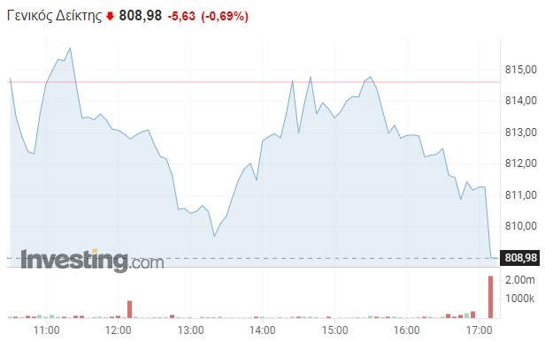 Πιο συγκεκριμένα, ο Γενικός Δείκτης σημείωσε μικρή πτώση κατά 0,69% και διαμορφώθηκε στις 808,98 μονάδες, χάνοντας τουλάχιστον 5,5 μονάδες σε σχέση με το κλείσιμο της Δευτέρας (814,61 μονάδες). Το τόξο των ημερήσιων διακυμάνσεων καθορίστηκε σε επτά μονάδες (από 808,92 έως 815,82 μονάδες), με τον τζίρο των συναλλαγών να μην υπερβαίνει τα 35,5 εκατομμύρια ευρώ.