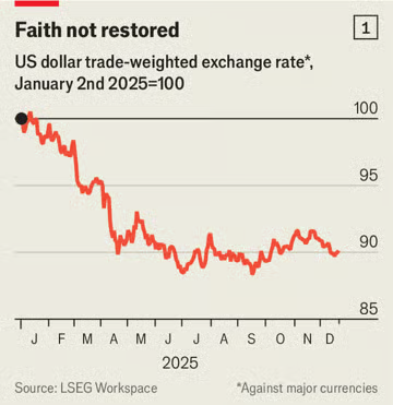 Οι αμερικανικές μετοχές ξεκίνησαν τη χρονιά ως κάτι το οποίο οι περισσότεροι επενδυτές απέφευγαν. Οι τιμές τους αυξήθηκαν κατά 26% το 2023 και 23% το 2024, σε σύγκριση με 14% και 2% αντίστοιχα για τις μετοχές που είναι εισηγμένες σε άλλες ανεπτυγμένες αγορές. Η αποδυνάμωση του δολαρίου εξηγεί εν μέρει αυτή την αλλαγή, αν και όχι εξ ολοκλήρου.