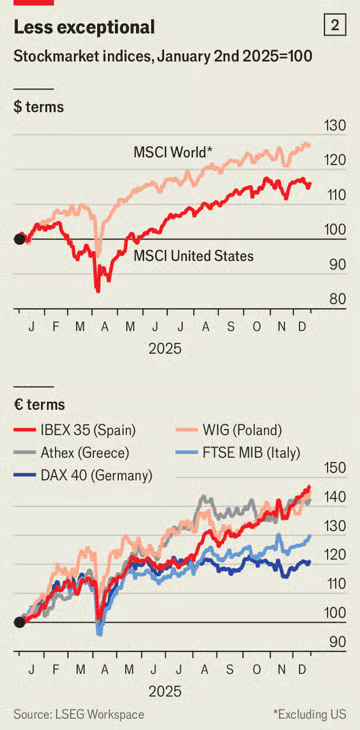 Οι ευρωπαϊκές αγορές έλαμψαν, ενισχυμένες από τα σχέδια της Γερμανίας να τονώσει την οικονομία της και από την αύξηση των αμυντικών δαπανών σε ολόκληρη την ήπειρο. Εντός της Ευρώπης σημειώθηκε μια άλλη ανατροπή: οι αγορές των πρώην «περιφερειακών» χωρών ξεπέρασαν αυτές των «κεντρικών». Μεταξύ των χωρών με τις καλύτερες επιδόσεις το 2025 συγκαταλέγονται η Ελλάδα, η Ιταλία, η Ισπανία και η Πολωνία. Οι τράπεζες που κάποτε αντιμετώπιζαν προβλήματα έχουν αποδώσει ιδιαίτερα καλά.