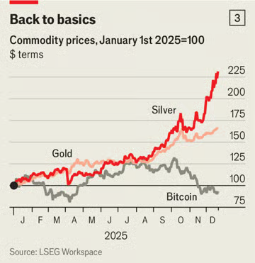 Οι επενδυτές, όπως αποδεικνύεται, προτιμούν τον πραγματικό χρυσό. Από τις αρχές του 2025, η τιμή του χρυσού έχει αυξηθεί κατά περισσότερο από 60%. Αντίθετα, το bitcoin έχει υποχωρήσει κατά 7% και υπέστη πτώση από το υψηλότερο στο χαμηλότερο σημείο του πάνω από 30% τον Οκτώβριο και τον Νοέμβριο. Αντί να αναζητούν ψηφιακές εναλλακτικές λύσεις για το πολύτιμο μέταλλο, οι επενδυτές στράφηκαν σε πιο παραδοσιακά υποκατάστατα. Το ασήμι έχει αποδώσει ακόμη καλύτερα από το χρυσό με την αξία του να υπερδιπλασιάζεται φέτος.