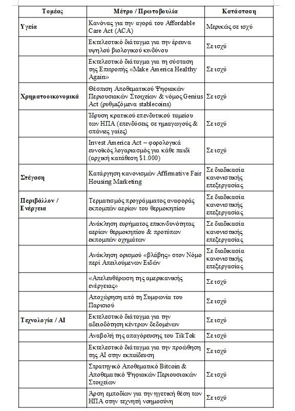 Η απορρύθμιση εστιάζει στους τομείς της υγείας, των χρηματοοικονομικών υπηρεσιών, της στέγασης, της ενέργειας και της τεχνητής νοημοσύνης. Το σχέδιο υποδομών για την τεχνητή νοημοσύνη θα απαιτήσει σημαντικές επενδύσεις στην ενέργεια, ενώ οι πηγές χρηματοδότησης αυτών των επενδύσεων εξελίσσονται. Οι ΗΠΑ και η Κίνα θα συνεχίσουν τον ανταγωνισμό τους για την παγκόσμια ηγεσία στην τεχνητή νοημοσύνη, ενώ τα ανθρωποειδή ρομπότ αποτελούν μια πολλά υποσχόμενη εφαρμογή.