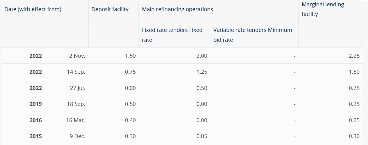 Αυτό σημαίνει ότι το βασικό επιτόκιο της Ευρωζώνης θα διαμορφωθεί στο 2,50%, το επιτόκιο καταθέσεων στο 2% και το επιτόκιο οριακές χρηματοδότησης στο 2,75%.