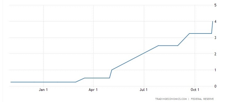 Σύμφωνα με τα στοιχήματα των traders, η Fed θα προβεί σε ακόμη μία αύξηση των επιτοκίων (σήμερα βρίσκονται στο 3,75% – 4%). Ωστόσο, αυτή η παρέμβαση αναμένεται να καθοριστεί στις 50 μονάδες βάσης και όχι στις 75, όπως συνέβη τις προηγούμενες τέσσερις φορές.
