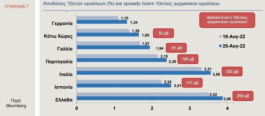 Η διαφορά απόδοσης μεταξύ του δεκαετούς ομολόγου της Ελλάδας και του δεκαετούς ομολόγου της Γερμανίας (spread) διαμορφωνόταν στις 254 μονάδες βάσης (μ.β.), του δεκαετούς πορτογαλικού ομολόγου στις 105 μ.β., ενώ του δεκαετούς ιταλικού ομολόγου στις 222 μ.β. Παράλληλα, η απόδοση του δεκαετούς ομολόγου της Γερμανίας, ως σημείο αναφοράς του κόστους δανεισμού της Ζώνης του Ευρώ (ΖτΕ), διαμορφωνόταν στο 1,34%, στις 25 Αυγούστου, ενώ η απόδοση του δεκαετούς ομολόγου των ΗΠΑ στο 3,09%.