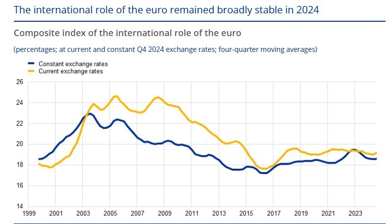 Στις διεθνείς αγορές συναλλάγματος, το ευρώ παρέμεινε σταθερό το 2024 διατηρώντας τη δεύτερη θέση που κατείχε μετά το δολάριο. Μάλιστα, το μερίδιο του ευρώ σε διάφορους δείκτες διεθνών νομισμάτων παρέμεινε ουσιαστικά αμετάβλητο από την εποχή της ρωσικής εισβολής στη Ρωσία, διατηρώντας ένα μερίδιο της τάξεως του 19%.