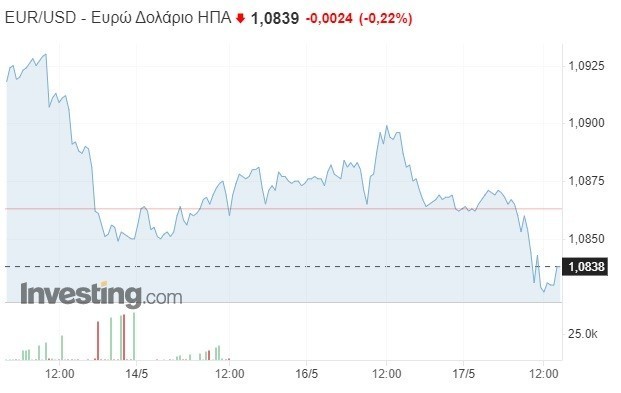 Πιο συγκεκριμένα, το ευρωπαϊκό νόμισμα υποχωρεί κατά 0,22% και ανέρχεται στο 1,0839 δολάριο, έχοντας ως υψηλό ημέρας το $1,0874 και ως χαμηλό ημέρας το $1,0821.