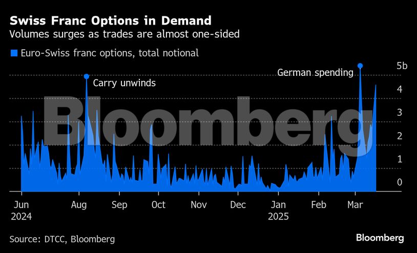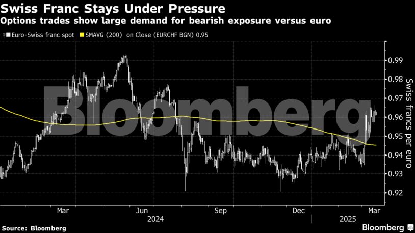 Σχεδόν οι μισές από τις συναλλαγές που πραγματοποιήθηκαν τη Δευτέρα σε σχέση με το φράγκο στοιχημάτιζαν ότι το ευρώ θα διαπραγματευόταν πάνω από τα 0,98 μετά τα μέσα Απριλίου, δηλαδή 2% πάνω από τα τρέχοντα επίπεδα spot, ενώ ένα call 132 εκατομμυρίων ευρώ που έληγε στα μέσα Αυγούστου στόχευε σε κίνηση πάνω από την ισοτιμία.