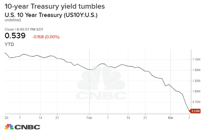 Η απόδοση του 10ετούς έχει υποχωρήσει κατά 40 μονάδες βάσης μόνο τον Μάρτιο. Η απόδοση του 30ετούς τίτλου επίσης υποχώρησε στο ιστορικό χαμηλό του 0,7104%, σπάζοντας το όριο του 1% για πρώτη φορά στην ιστορία του.