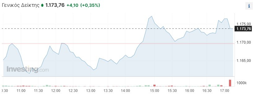 Πιο αναλυτικά, ο Γενικός Δείκτης σημείωσε μικρή άνοδο κατά 0,35% και διαμορφώθηκε στις 1.173,76 μονάδες, κερδίζοντας τέσσερις μονάδες σε σχέση με το κλείσιμο της Παρασκευής (1.169,66 μονάδες). Το τόξο των ημερήσιων διακυμάνσεων καθορίστηκε σε 16 μονάδες (από 1.161,22 έως 1.177,33 μονάδες), με τον τζίρο των συναλλαγών να κυμαίνεται στα 65,5 εκατ. ευρώ.