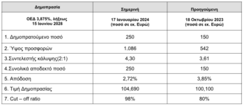 Οι συνολικές προσφορές ανήλθαν σε 1.086 εκατ. Ευρώ και η ημερομηνία διακανονισμού είναι η Τετάρτη 24 Ιανουαρίου 2024.