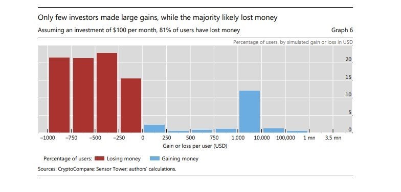 Τα στοιχεία έρχονται από έκθεση ενός από τα κορυφαία κεντρικά τραπεζικά ιδρύματα, της Τράπεζας Διεθνών Διακανονισμών (BIS). Η έκθεση, με τίτλο “Crypto trading και τιμές του Bitcoin: Στοιχεία από μια νέα βάση δεδομένων από την υιοθέτηση της retail αγοράς”, συμπεραίνει ότι οι περισσότεροι νέοι επενδυτές στα κρυπτονομίσματα, ποσοστό μεταξύ 73% ως 81%, “αναπόφευκτα έχασαν χρήματα στην αρχική τους επένδυση”.