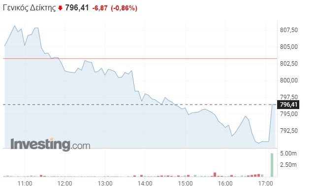 Πιο συγκεκριμένα, ο Γενικός Δείκτης σημείωσε αξιοσημείωτη πτώση κατά 0,86% και υποχώρησε στις 796,41 μονάδες, χάνοντας σχεδόν επτά μονάδες σε σχέση με το κλείσιμο της Τετάρτης (803,28 μονάδες). Το τόξο των ημερήσιων διακυμάνσεων καθορίστηκε σε 18 μονάδες (από 790,48 έως 808,59 μονάδες), με τον τζίρο των συναλλαγών να μην υπερβαίνει τα 61 εκατομμύρια ευρώ.