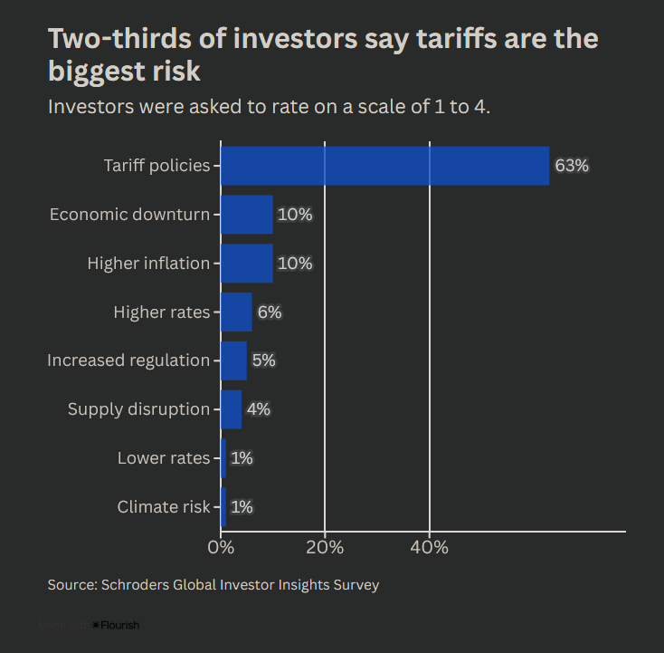 Σχεδόν τα δύο τρίτα (63%) των θεσμικών επενδυτών και των διαχειριστών περιουσίας αναγνώρισαν τους εμπορικούς δασμούς ως το σημαντικότερο μακροοικονομικό πρόβλημα που επηρεάζει τη στρατηγική τους, σύμφωνα με έρευνα που δημοσιεύθηκε από τη βρετανική εταιρεία διαχείρισης επενδύσεων Schroders.