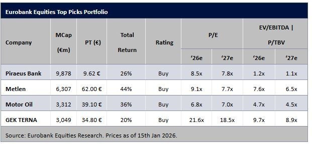 Η ένταση του ράλι το 2025 δημιουργεί αναπόφευκτα μια υψηλή βάση εκκίνησης για το 2026, ιδίως αν ληφθεί υπόψη ότι ο Γενικός Δείκτης καταγράφει ήδη άνοδο περίπου 6% από την αρχή του έτους. Υπό αυτές τις συνθήκες, εκτιμά ότι η αγορά περνά σταδιακά από μια φάση που καθοδηγούνταν κυρίως από το γενικό ρίσκο (beta) σε ένα πιο επιλεκτικό περιβάλλον, με έμφαση στα θεμελιώδη μεγέθη. Το 2026 αναμένεται έτσι να εξελιχθεί σε «αγορά επιλογής μετοχών», όπου η ορατότητα και η ποιότητα των κερδών θα έχουν πολύ μεγαλύτερη σημασία από την περαιτέρω διεύρυνση των αποτιμησιακών πολλαπλασιαστών.