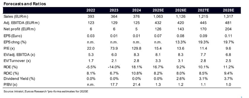 Αναμένουμε, αναφέρει η Euroxx, ότι το προσαρμοσμένο EBITDA θα υπερβεί τα 480 εκατ. ευρώ έως το 2028, χάρη στις συνέργειες μετά τη συναλλαγή BII και τα περιθώρια κέρδους που είναι πολύ υψηλότερα από αυτά των ανταγωνιστών.