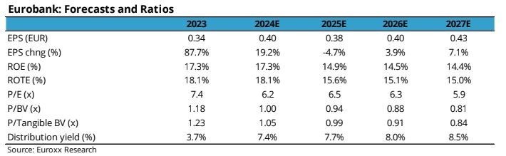 Για το 2027 οι μετοχές διαπραγματεύονται με P/E 5,9x, P/TBV 0,78x και μερισματική απόδοση της τάξης του 8% ετησίως. Πιστεύουμε ότι αυτό είναι φθηνό σε σχέση με την περιφέρεια (P/E για το 2027 στο 8,2x, P/BV 0,96x και μερισματική απόδοση του 7,2%), με τη Eurobank να εμφανίζει ανώτερο βιώσιμο ROTE (15% έναντι 13% για ανταγωνιστές στη Νότια Ευρώπη).