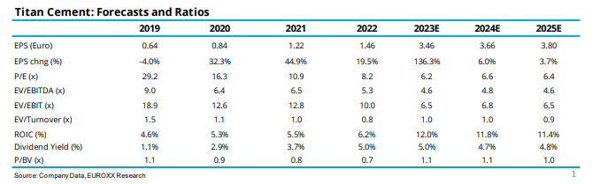 Με σύσταση Overweight και τιμή στόχο στα 36 ευρώ ανά μετοχή ξεκινά την κάλυψη της Titan Cement International η Euroxx. Η μετοχή επί του παρόντος διαπραγματεύεται για το 2024 με EV/EBITDA 4,8 φορές έναντι μέσου όρου 20ετίας 7,8. . Το discount σε σχέση με τις ομοειδείς εταιρείες των ΗΠΑ (οι οποίες αντιπροσωπεύουν περίπου το 55% των EBITDA της Τιτάν) είναι μεγαλύτερο του 60% και σε σχέση με τις μη αμερικανικές επιχειρήσεις 20-30%.