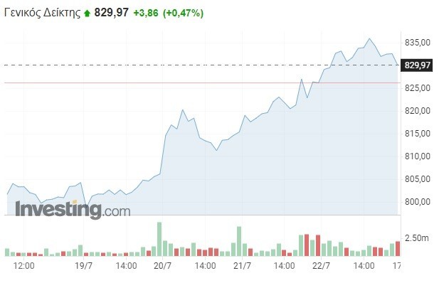 Η Λεωφόρος Αθηνών, έπειτα από μια εβδομάδα πυκνών εξελίξεων, κατάφερε να κάνει το 5×5 και να συντηρήσει το θετικό momentum, κατοχυρώνοντας παράλληλα ένα μέρος των υψηλών κερδών του πενθημέρου, τα οποία ανήλθαν στο 4,5% και τα οποία επανέφεραν τον Γενικό Δείκτη στις 830 μονάδες (το υψηλότερο επίπεδο του τελευταίου ένα μήνα).