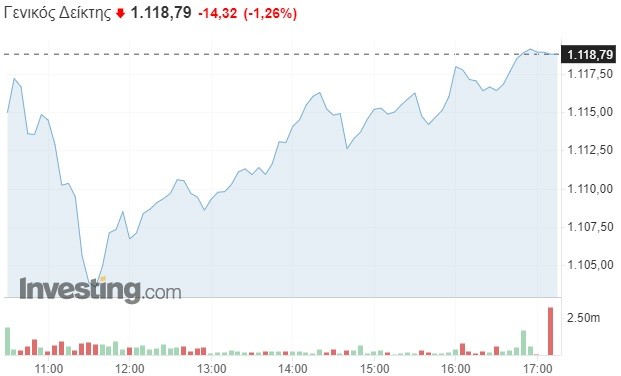Πιο αναλυτικά, ο Γενικός Δείκτης σημείωσε κάμψη κατά 1,26% και διαμορφώθηκε στις 1.118,79 μονάδες, χάνοντας σχεδόν 14,5 μονάδες σε σχέση με το κλείσιμο της Τετάρτης (1.133,11 μονάδες). Το τόξο των ημερήσιων διακυμάνσεων καθορίστηκε σε 18 μονάδες (από 1.102,94 έως 1.120,21 μονάδες), με τον τζίρο των συναλλαγών να κυμαίνεται στα 114,9 εκατομμύρια ευρώ.