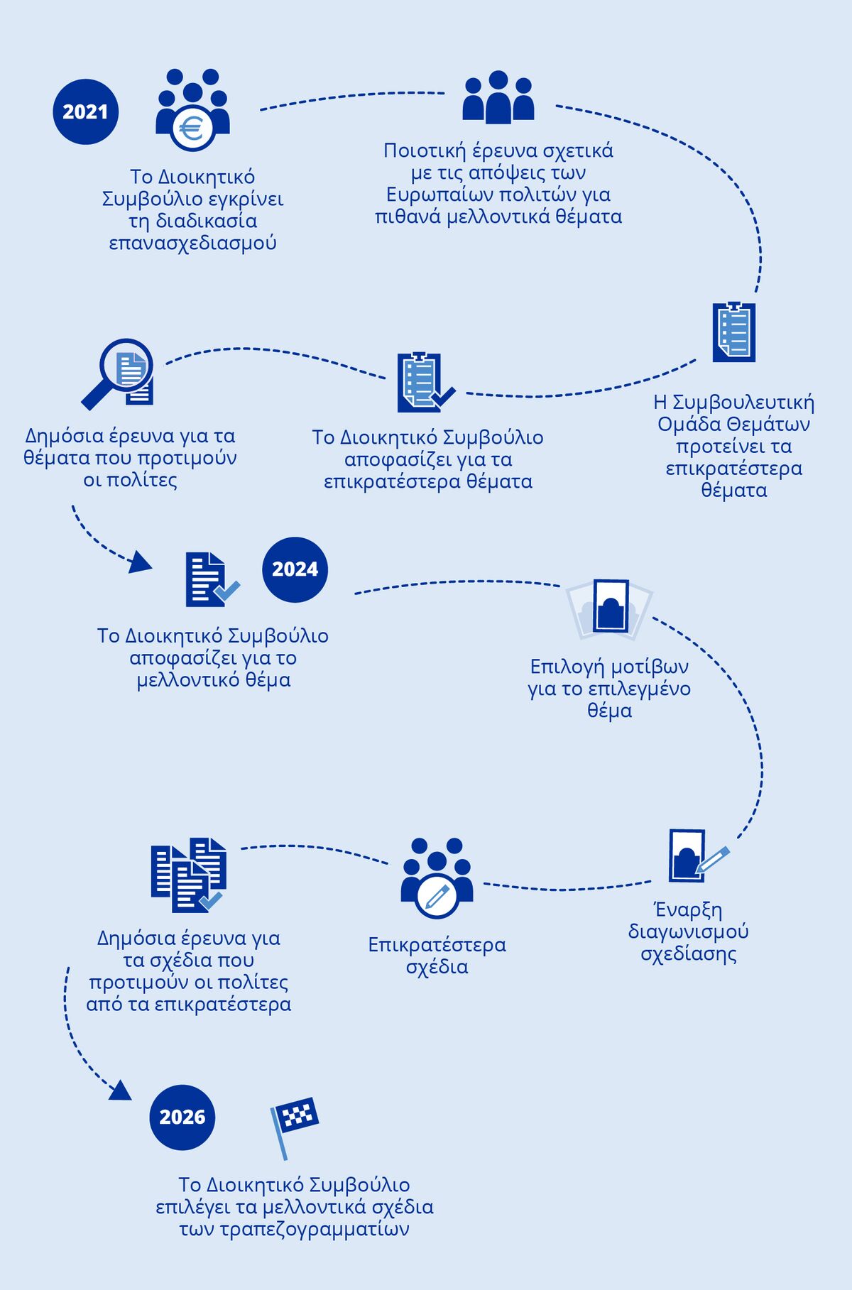Στη συνέχεια, θα διεξαχθεί διαγωνισμός για τον σχεδιασμό των νέων τραπεζογραμματίων και οι Ευρωπαίοι πολίτες θα έχουν και πάλι την ευκαιρία να εκφράσουν τις προτιμήσεις τους για τις επιλογές σχεδίων.