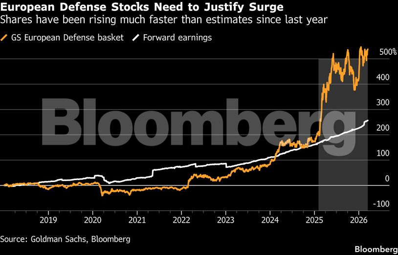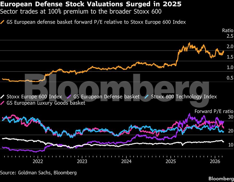 Οι αποτιμήσεις έχουν φτάσει σε επίπεδα υψηλότερα ακόμη και από τον τεχνολογικό ή τον πολυτελή κλάδο, με τις αμυντικές εταιρείες να διαπραγματεύονται ψηλά σε σχέση με τον δείκτη Stoxx Europe 600.