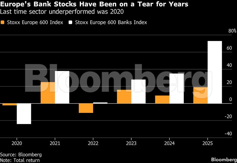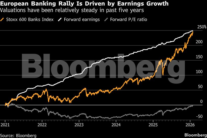 Τα ανθεκτικά κέρδη και οι γενναιόδωρες αποδόσεις προς τους μετόχους βρίσκονται πίσω από το ισχυρό ράλι των ευρωπαϊκών τραπεζικών μετοχών, οι οποίες το 2025 κατέγραψαν απόδοση 77% μαζί με τα επανεπενδυμένα μερίσματα, ξεπερνώντας για πέμπτη συνεχόμενη χρονιά τον δείκτη Stoxx Europe 600. Από τις αρχές του 2026, ο τραπεζικός δείκτης ενισχύεται επιπλέον κατά 5% και βρίσκεται στο υψηλότερο επίπεδο από τη χρηματοπιστωτική κρίση του 2008.