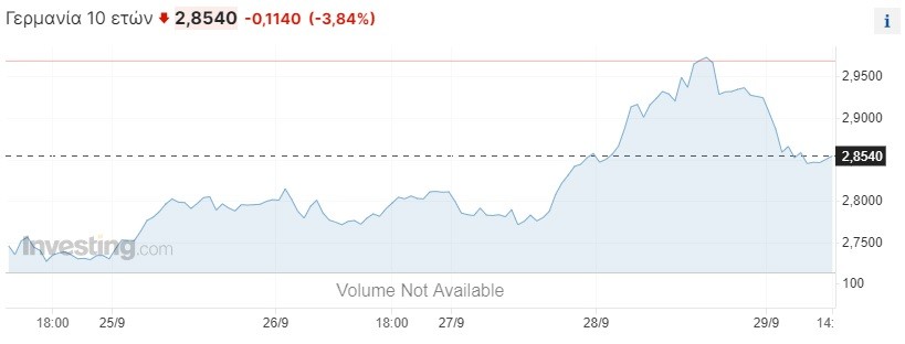 Ενδεικτικά, την Παρασκευή, η απόδοση του 10ετούς ομολόγου της Γερμανίας υποχώρησε κατά 11 μονάδες βάσης και έπεσε στο 2,85%, παίρνοντας «ανάσα» μετά την εκτόξευση στο υψηλότερο επίπεδο από το 2011 (2,9%).